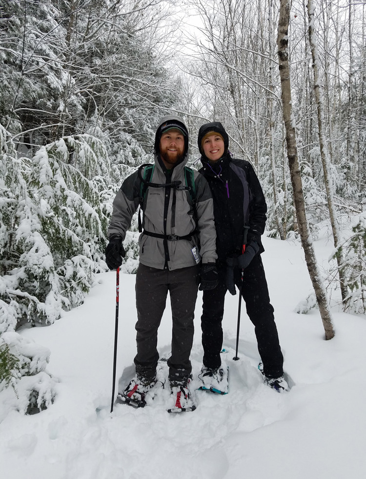 Nitin & Kirti arrived at the Trail Break on December 29. The next day, Todd & Carolyn arrived from Ohio. It snowed heavily that night, so when my four guests asked what they could do after such weather, I said, “Snowshoe time!” They all agreed, so I took them to Gorham Hardware where they all rented snowshoes and learned how to attach them.
